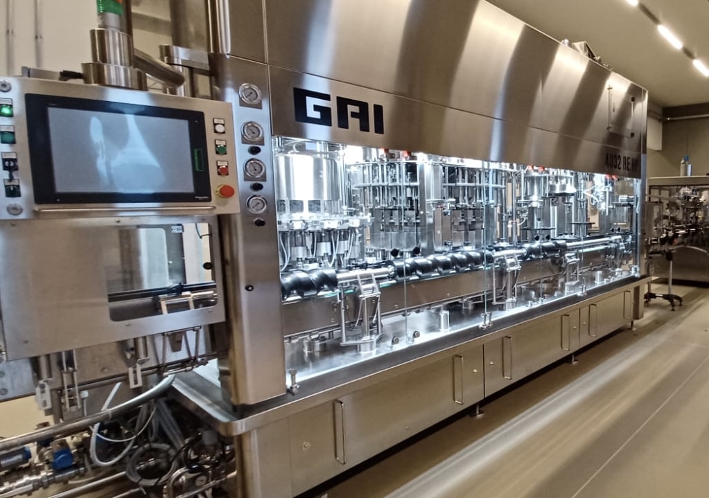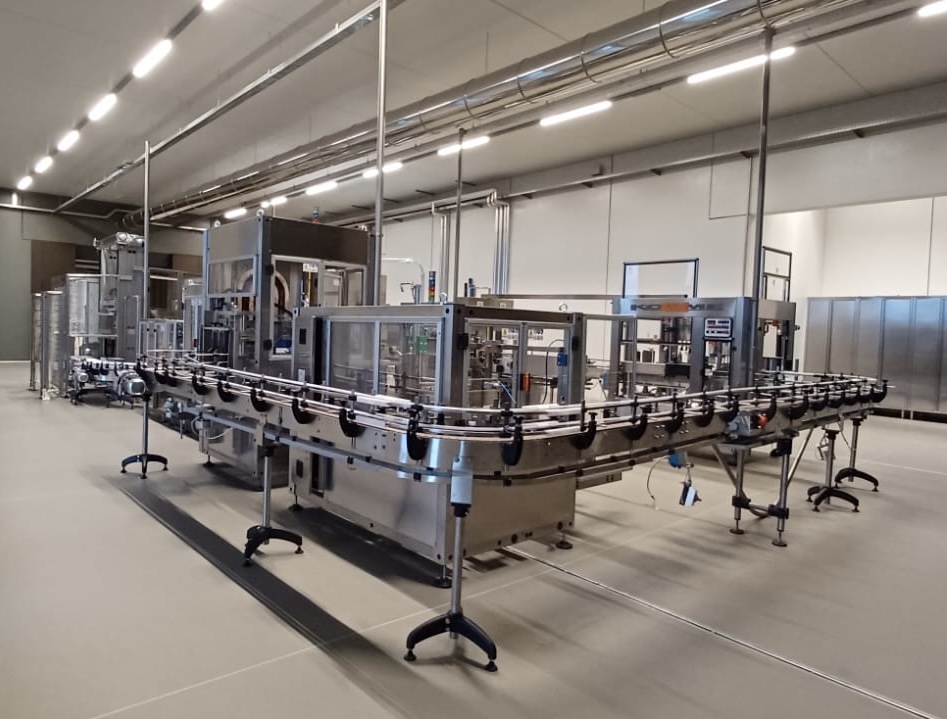 La linea si presenta ora completa di riempitrice, capsulatrice, etichettatrice e infine depallettizzatore correttamente installati.